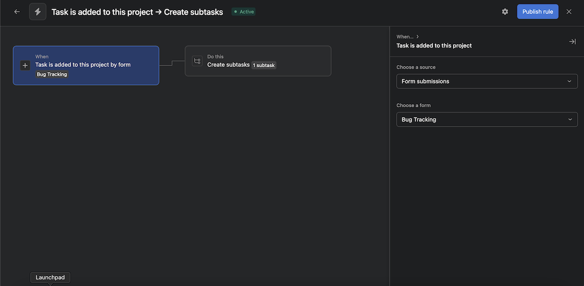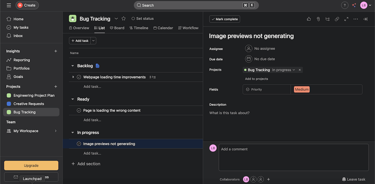 In Asana, you can organize tasks in 9 views — 4 with a free plan. In the free plan, tasks are restricted to only the basic fields, like assignee, due date, and priority. Paid plan users can create custom fields. Asana also has a robust Rules system that manages to stay sleek and intuitive — but that’s a premium-only feature too.