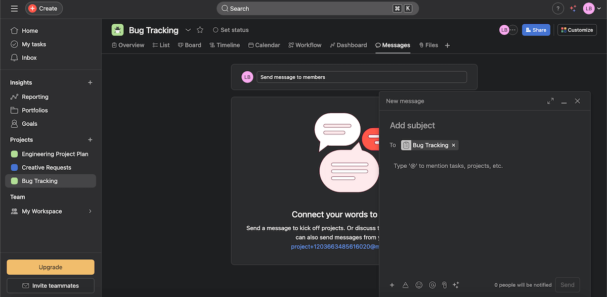 Asana has plenty of spaces for communication, where you can @mention team members, share files, send links, etc. These are: