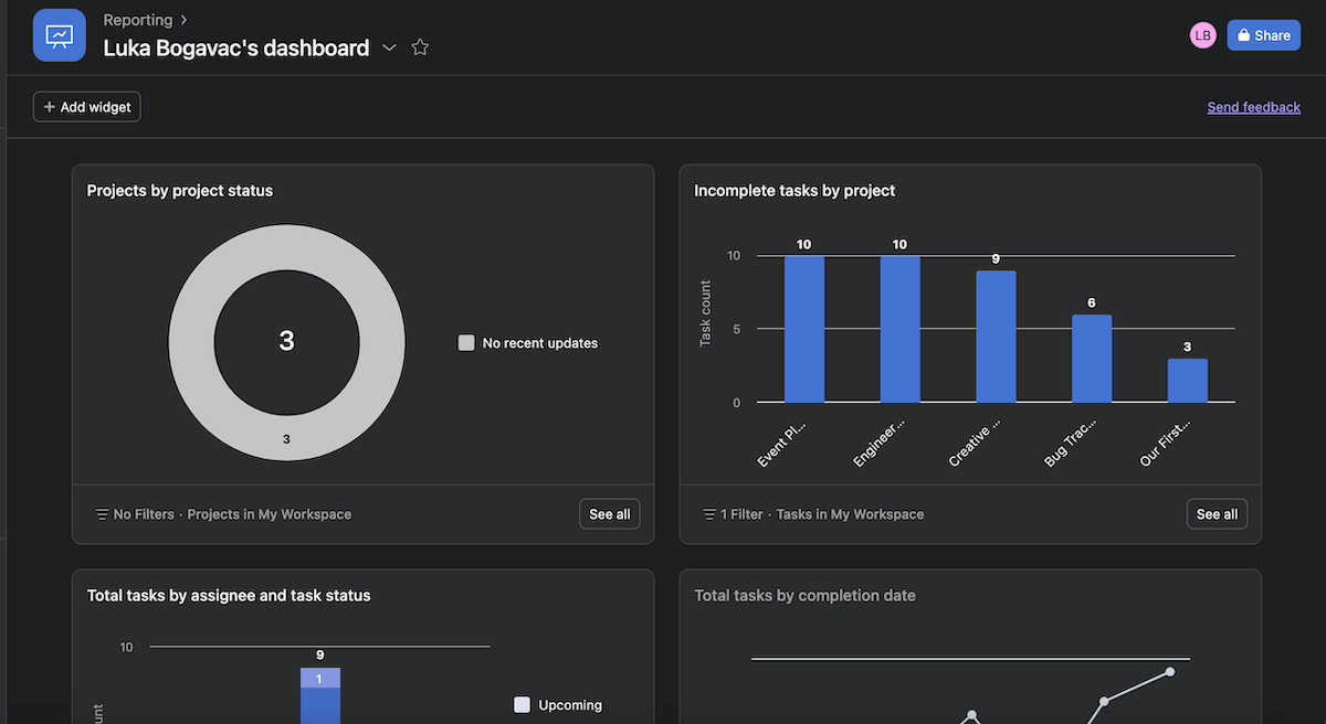 The other progress-tracking option in Asana is creating reports, which lets you track your project in real time with plenty of customization options. You can even change chart types and add filters to create the best report structure.