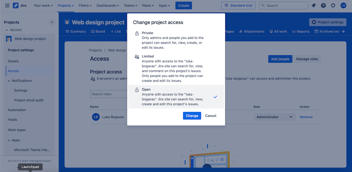 Jira has an immediate disadvantage in its free plan — every member is considered an admin. This means that any member of a project has full access to it, so they’re able to change whatever they want. This’ll work out great for small teams that trust each other — but it won’t hold for any complex endeavor with many moving parts.