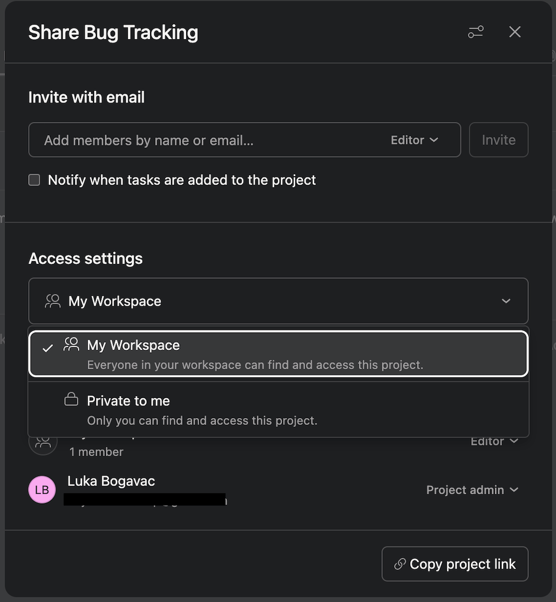 - Private — Only invited members get access. This also means you can be the only member, so it becomes a personal, private project.
