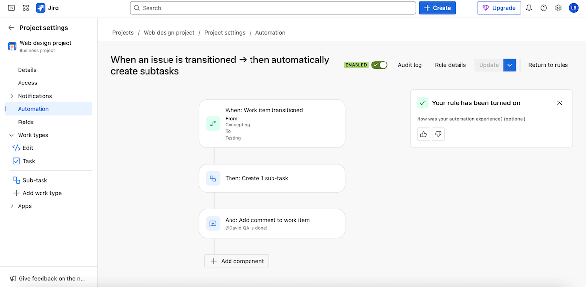 Jira also offers automation options, using rules, just like Asana. Like everything else in Jira, rules are a bit more complex, but that also means they have more to offer. With the right mastery, they can prove to be much more valuable.