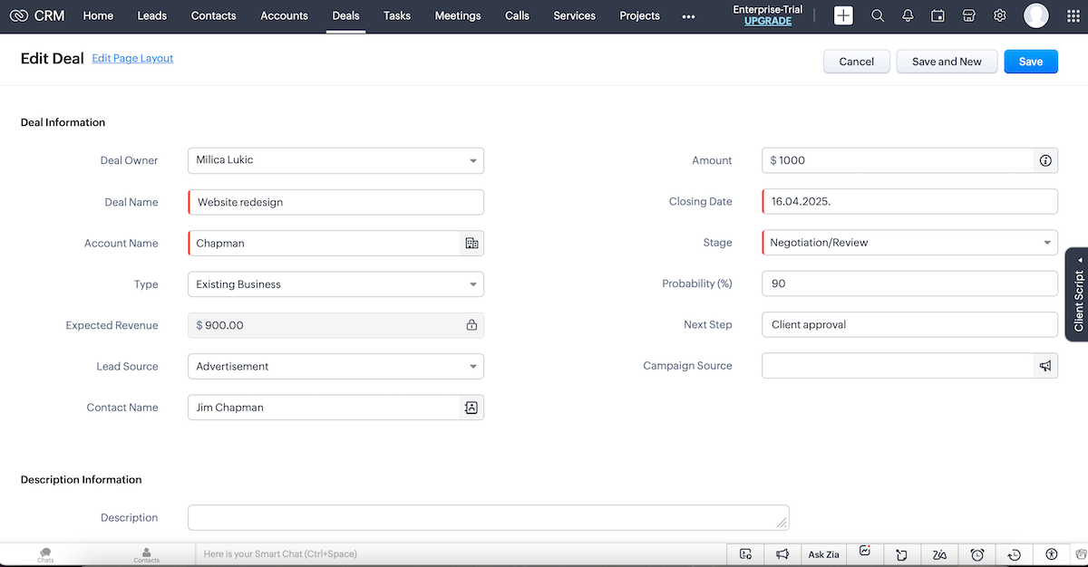 - Automations — Set up automation rules (e.g., “when a deal is marked won, assign onboarding task”) to save time and minimize errors.