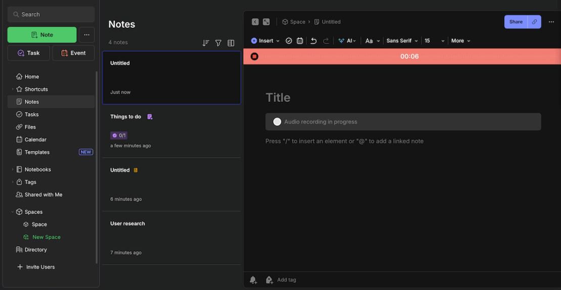 Further, the UI is not as user-friendly as I wanted it to be. As far as I could figure out, you can only create tasks in your Space — not in notebooks, not in the Note tab. I couldn’t find where I could input different types of notes either — until I saw I had to click the description field to start writing, only for more options to appear.