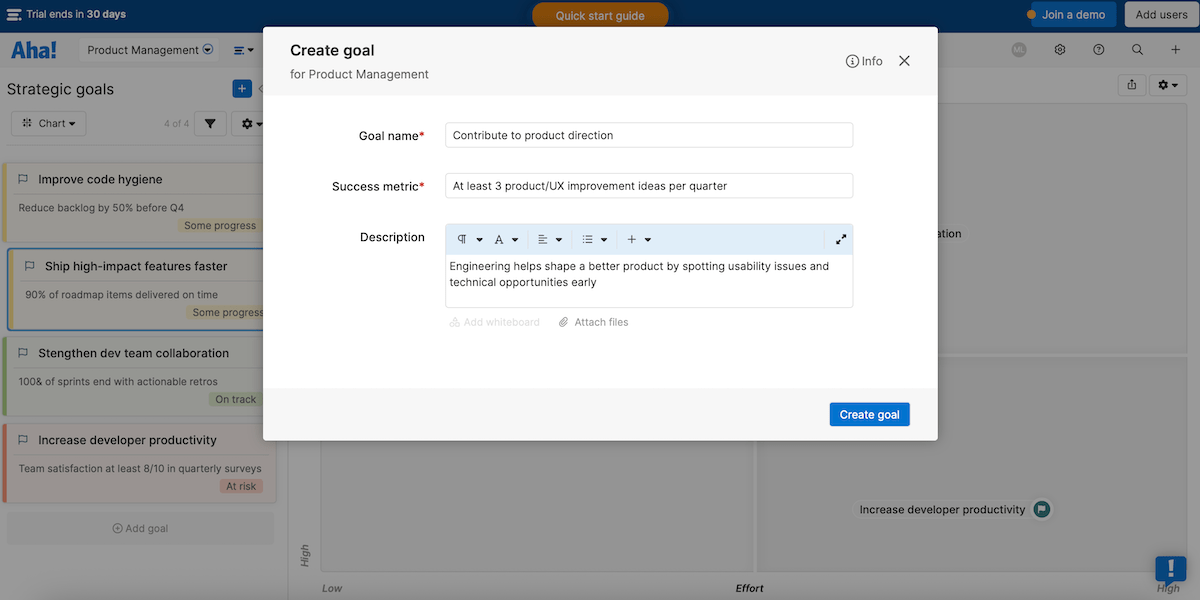 - Clear vision — Tie every piece of work in your roadmap back to strategy (e.g., goals, initiatives) to ensure you’re building with purpose.