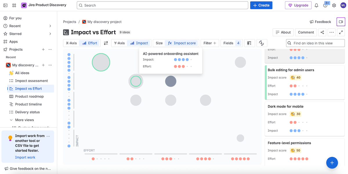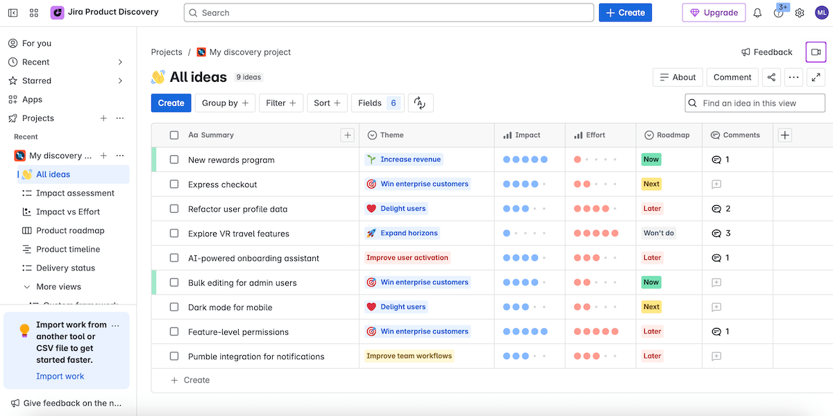 Jira Product Discovery (JPD) helps product teams organize, prioritize, and share ideas in a single place. It’s part of the Jira ecosystem, so it integrates well with Jira Software, making it extra useful for those already using Jira for development.