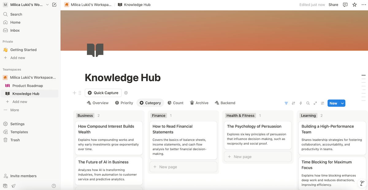 And now, Notion’s strongest point — knowledge organization. I’ve personally used Notion for this purpose in several scenarios over the past year, and this is what stands out: