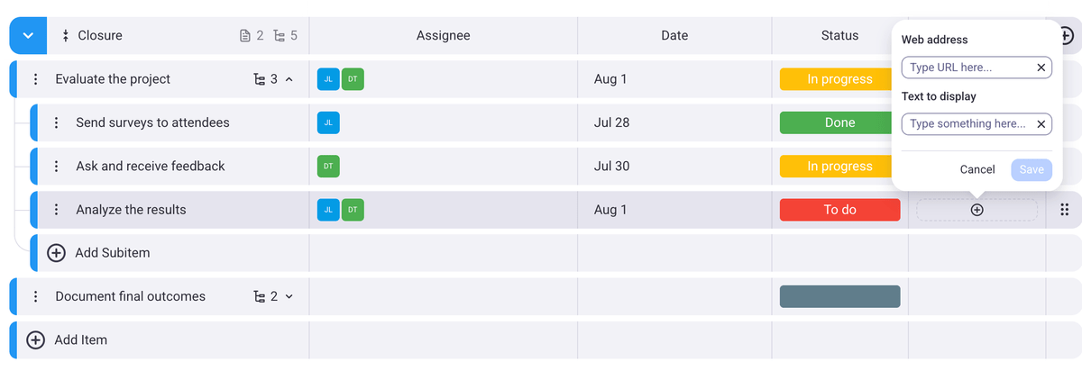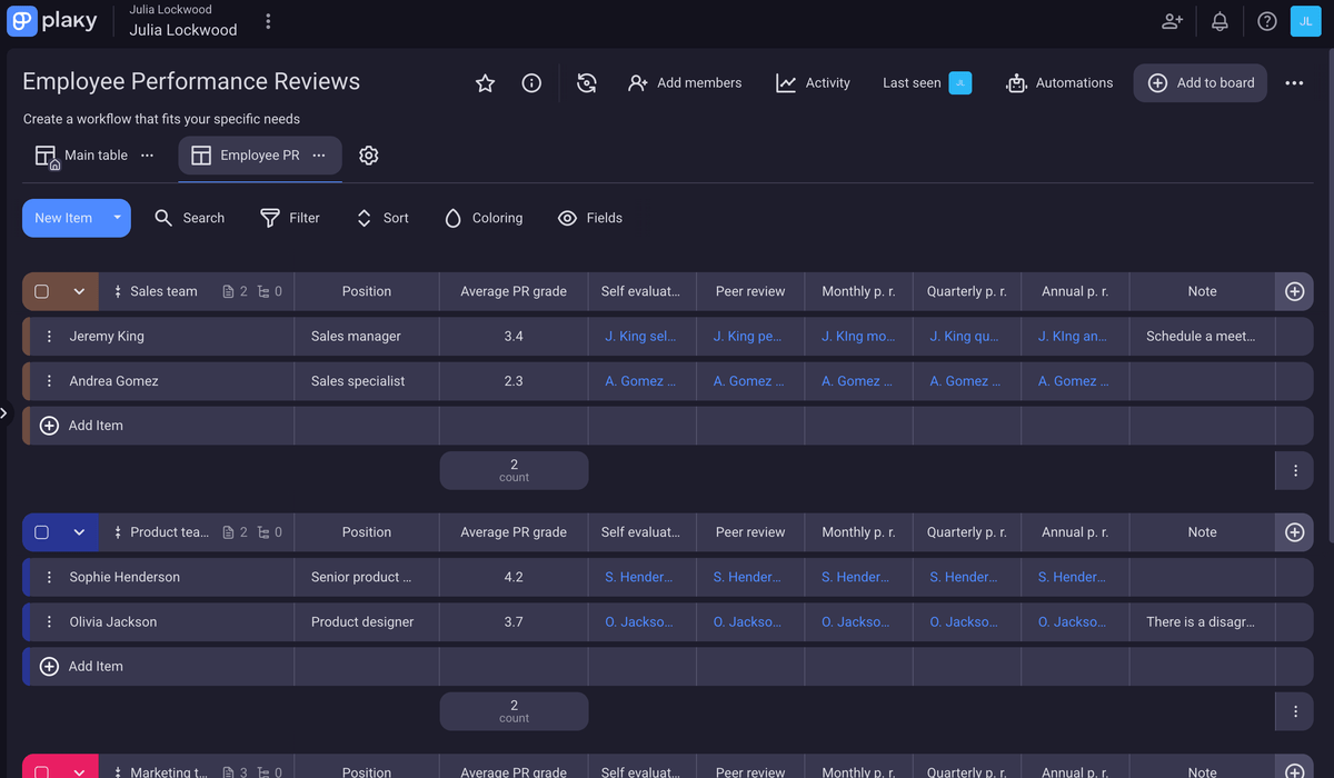 With Plaky, you can also easily organize employees’ performance reviews within a single dedicated board. Along with other employee information, you can link to all performance reviews, from self-evaluation to annual performance review, using Plaky’s Link custom field.
