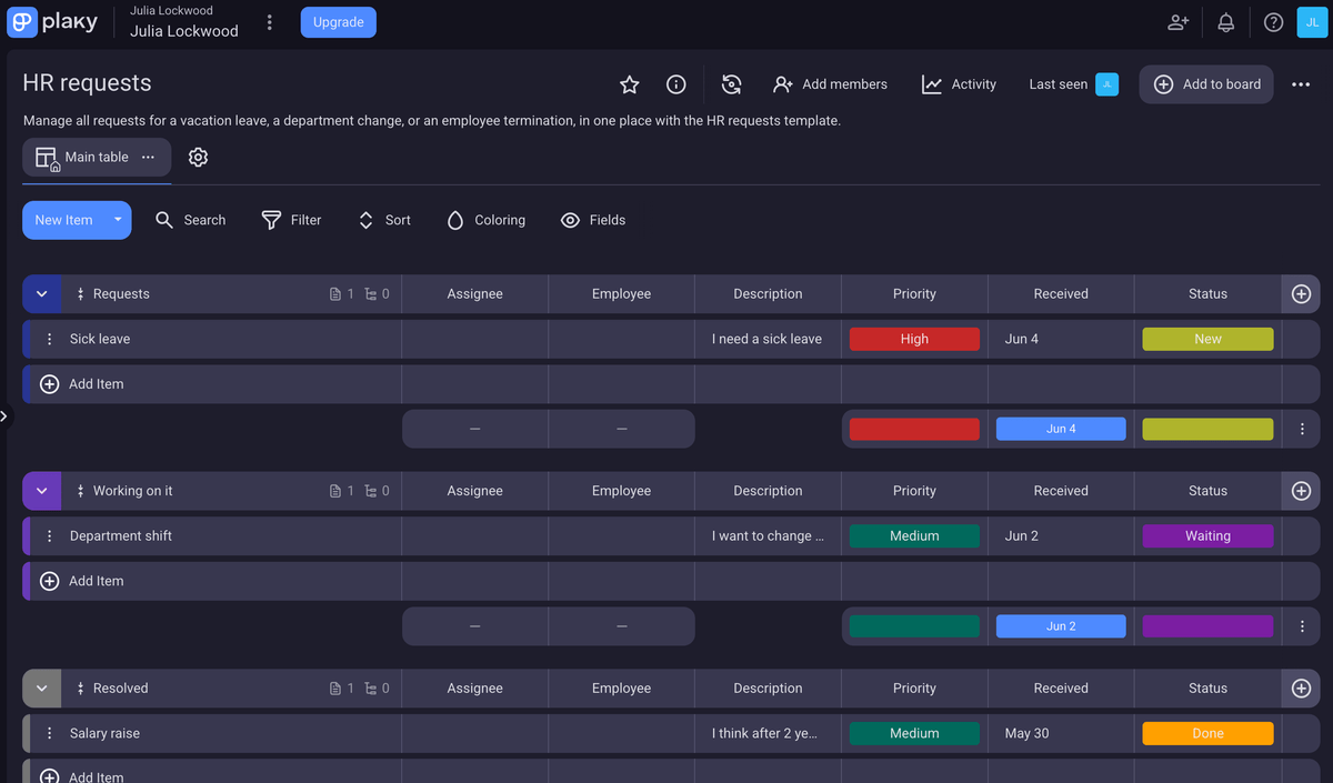You can easily manage all HR requests with the help of Plaky. Use our ready-made HR requests template to: