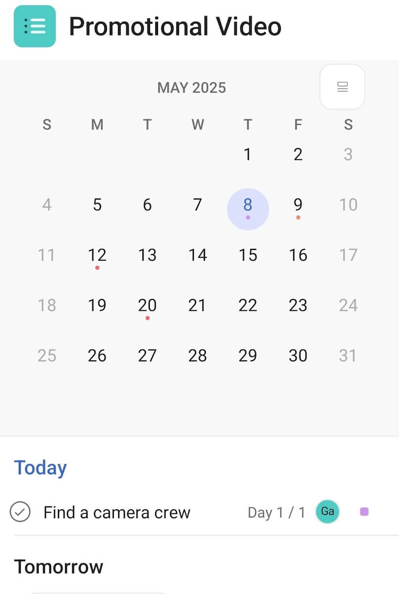 The calendar view is especially useful since it provides you with a clear overview of all your video production tasks, enabling you to notice possible bottlenecks, overlaps in project timelines, and other problems with the schedule.