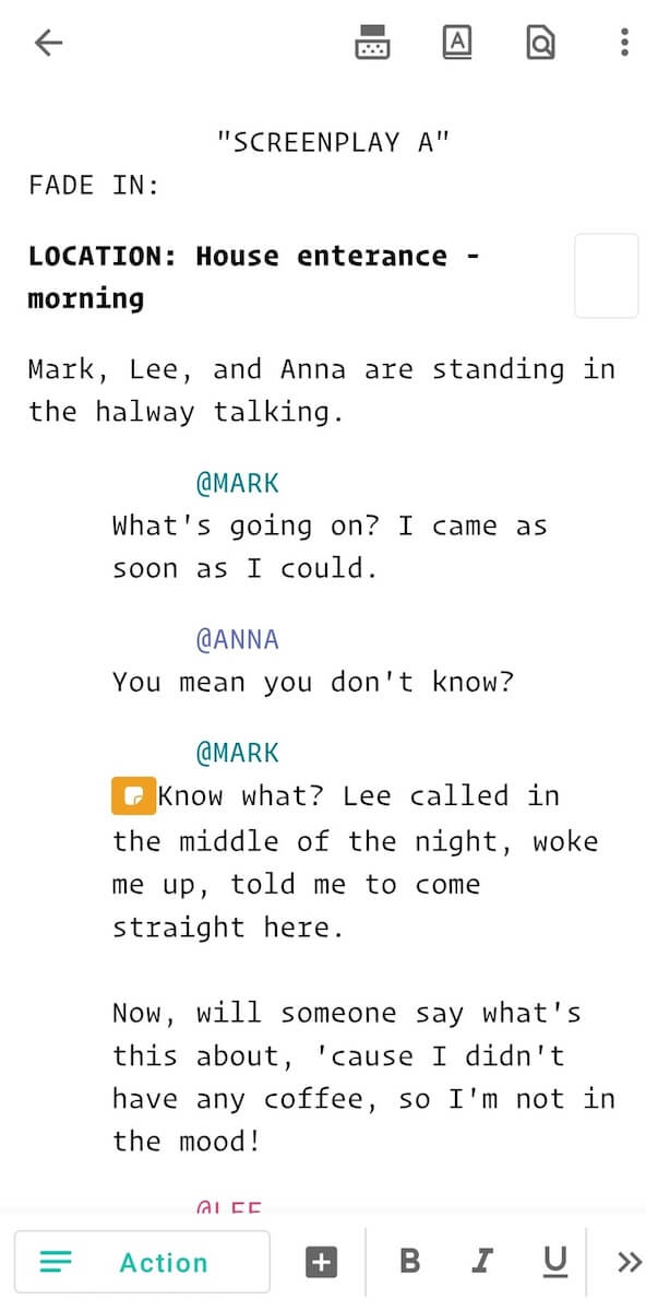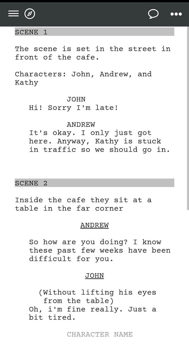 The overall look of Celtx scripts in the app itself is clear. You can easily add different sections, such as character, act, and dialogue.
