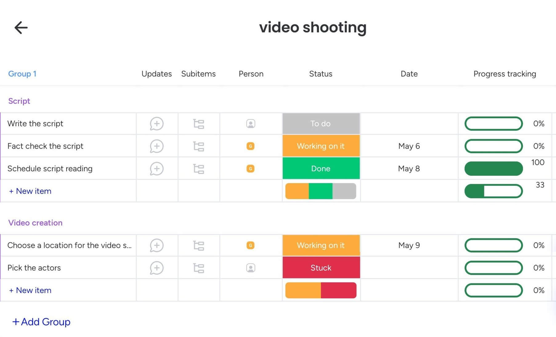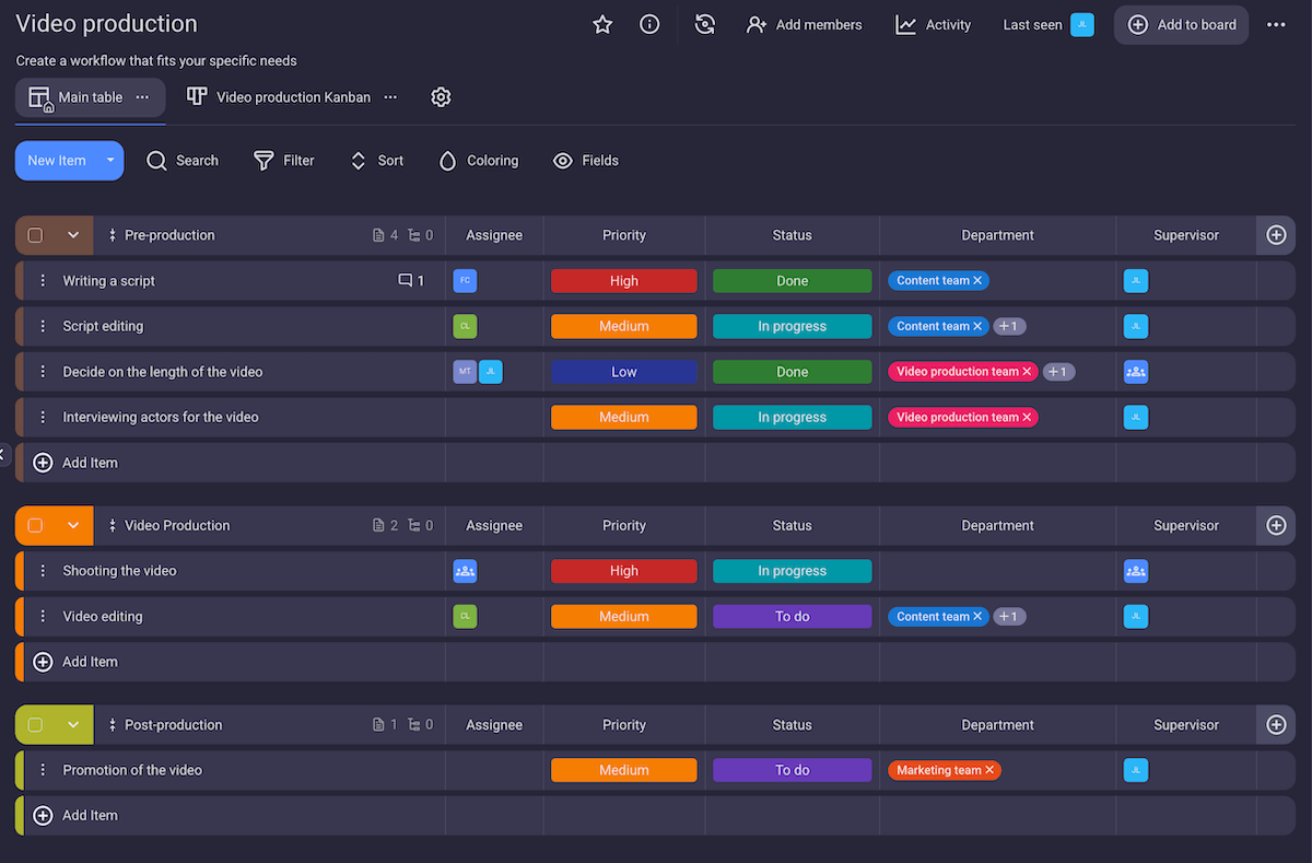 What’s nice about it is that monday.com offers many pre-made, editable templates you can simply import and use. One of them is a neat video production management template that will transform monday.com into a film production management tool. Within this template, you can: