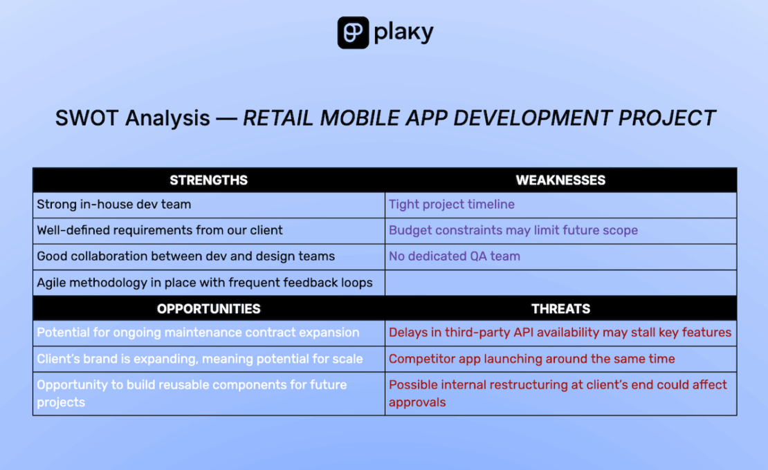 To show you how the SWOT analysis works in practice, let’s look at an example — a team developing a custom mobile app for a retail client.