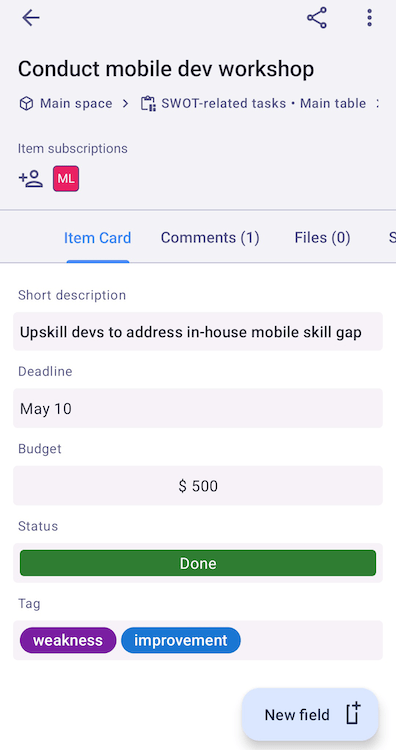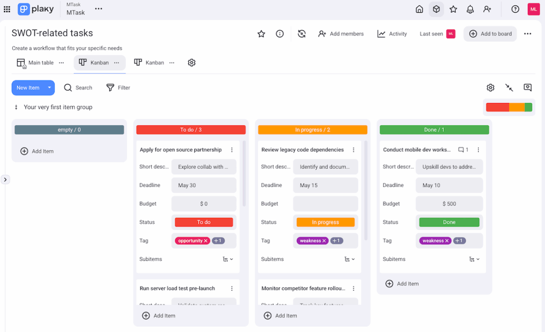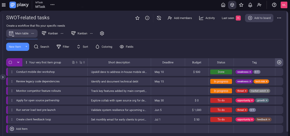 To begin with, the spaces-boards-items hierarchy in Plaky keeps things clean and navigable. For example, you can create a board with SWOT-related tasks (items) within your team’s workspace and arrange them however you like.
