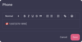 Si necesitas más formas de filtrar y organizar tus elementos, personaliza tus campos. Algunos campos adicionales podrían ser: número de contacto, dirección de correo electrónico, etc. Con el formato de texto enriquecido, puedes añadir archivos de texto e íconos para gestionar visualmente los datos de tus clientes.