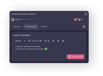 Evita los correos electrónicos. Comunícate con los compañeros justo en la tarjeta de la tarea o invita a los vendedores como lectores. Obtén comentarios y aprobaciones más rápido. Recibe notificaciones y alertas y actúa a tiempo.