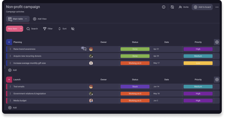 Ten una visión y deja que tu equipo se alinee con tu misión. Inicia, gestiona y realiza un seguimiento de las actividades de recaudación de fondos, canales de donaciones y solicitudes de subvenciones. Presupuesta, prioriza y asigna tareas fácilmente.