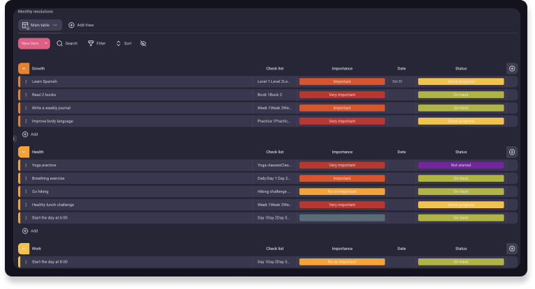 Organiza tus objetivos en grupos que te ayudarán a distinguir entre diferentes tipos de actividades y te ayudarán a planificar y gestionar tus metas de una manera simple y clara.