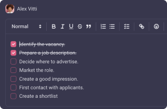 Está al tanto del historial de empleo, la solicitud, la carta de presentación y la experiencia de cada candidato, colocándolos todos en la tarjeta de tarea. Deja que el equipo de recursos humanos siempre tenga acceso y sepa dónde se encuentra cada candidato en cualquier momento del proceso de reclutamiento.