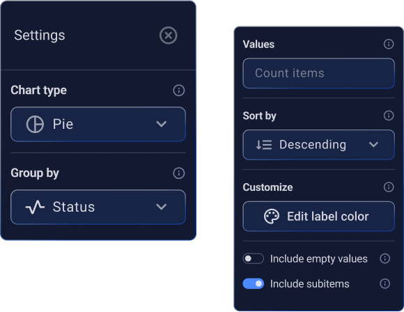 Refine your chart's appearance and data from the Settings panel. Adjust options like sorting, label colors, including empty values, or counting subitems.