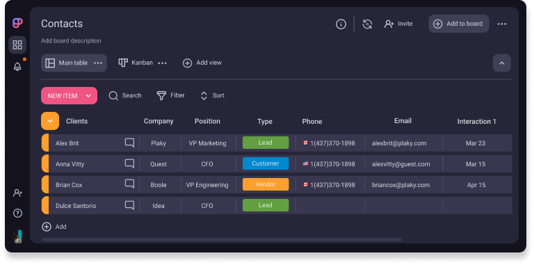 Collectez des prospects de n'importe quelle source et classez-les en un seul endroit. Cela aide les équipes de vente à améliorer le service client en disposant de tous les contacts et de toutes les données sur les clients sur un tableau.