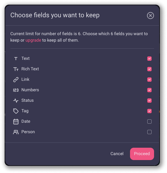 To resolve it, choose the fields to keep on the Board, within the designated number of fields for your subscription plan.