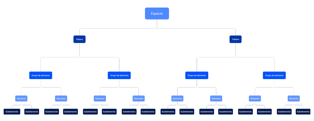 Espacio es la entidad más alta en la jerarquía de gestión de proyectos en Plaky. Se constituye de tableros, que contiene grupos de elementos, elementos (tareas) y subelementos (subtareas).