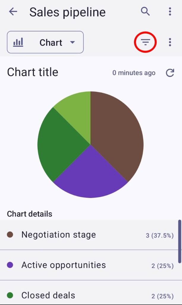 El gráfico se actualizará automáticamente cada 15 minutos o cuando cambies los datos de tablero relevantes (por ejemplo, añadir un nuevo elemento, aplicar los filtros, cambiar la configuración del gráfico). Si quieres actualizar el gráfico manualmente, puedes hacer clic en el botón de actualización
