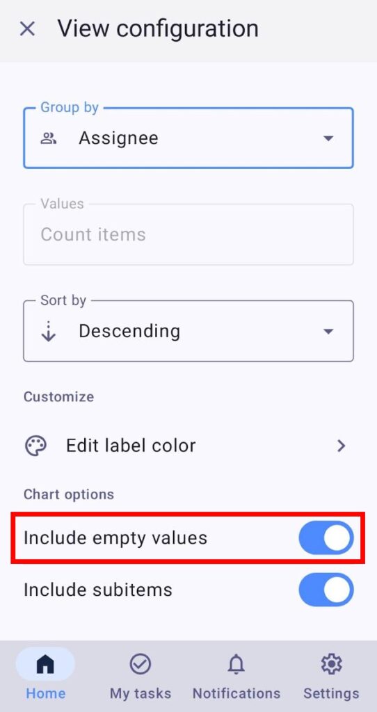 Puedes elegir si quieres mostrar o ocultar elementos sin datos importantes en tu gráfico. Por ejemplo, si agrupas elementos por persona, esta opción creará una porción separada que muestra el número de elementos sin individuos asignados a ellos. Esto puede resultar útil cuando quieres destacar la proporción de tareas no asignadas en tu proyecto.