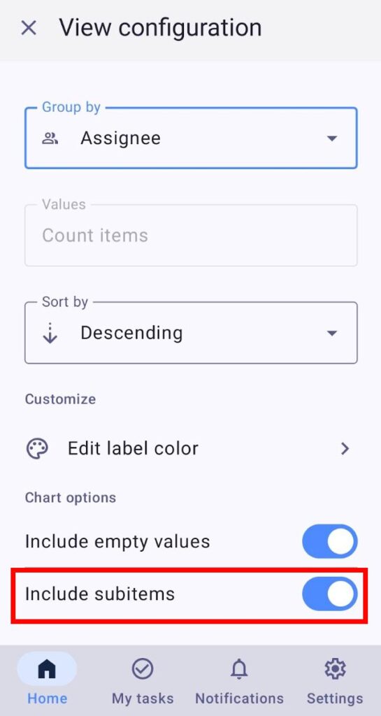 Los subelementos se pueden incluir en tu gráfico, y se pueden contar juntos con elementos regulares. Por ejemplo, si tienes 2 elementos y 5 subelementos, el valor total para la etiqueta será 7. Esto puede ser útil cuando quieres ver el cargo de trabajo total, incluyendo tanto las tareas principales como sus subtareas.