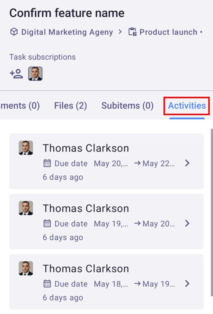 El Registro de actividad del elemento sigue todas las actualizaciones realizadas en un elemento.