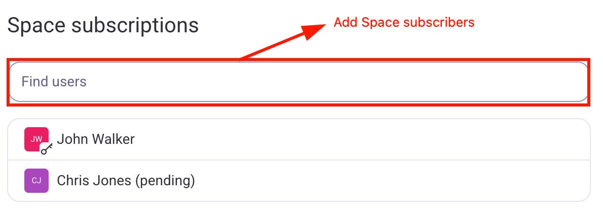 You can subscribe members to a Space by writing their name in the Space subscription field. Space subscribers are recognized as members and can access Boards and Items within that Space.
