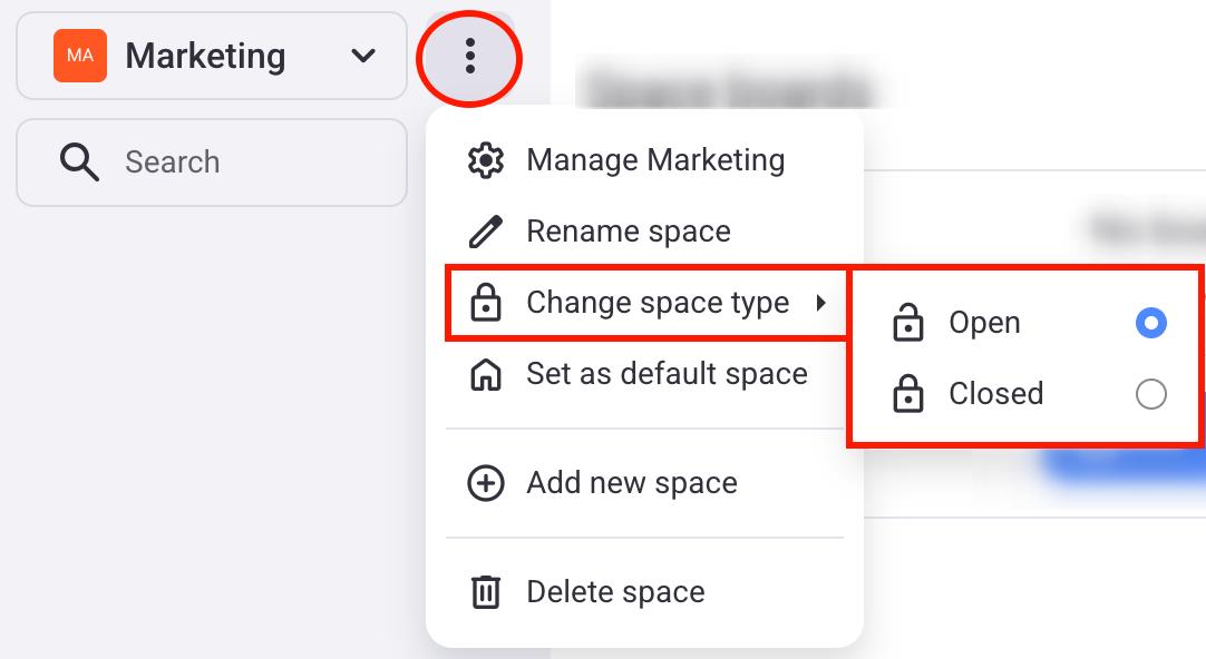 A space can be open or closed. Open space can be accessed by all members of the workspace, while a closed space is available only if a member is invited to it. Here’s how to change a space type: