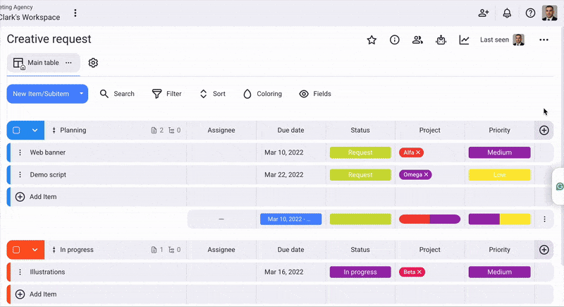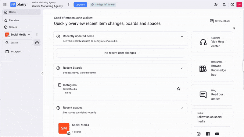 Boards are an integral part of every Space, and they contain multiple Items and Subitems, which are organized into Item groups. Imagine a Board being a larger project that you and your team are working on. For example, if you have a Space dedicated to marketing, you can have a Board for your social media tasks.