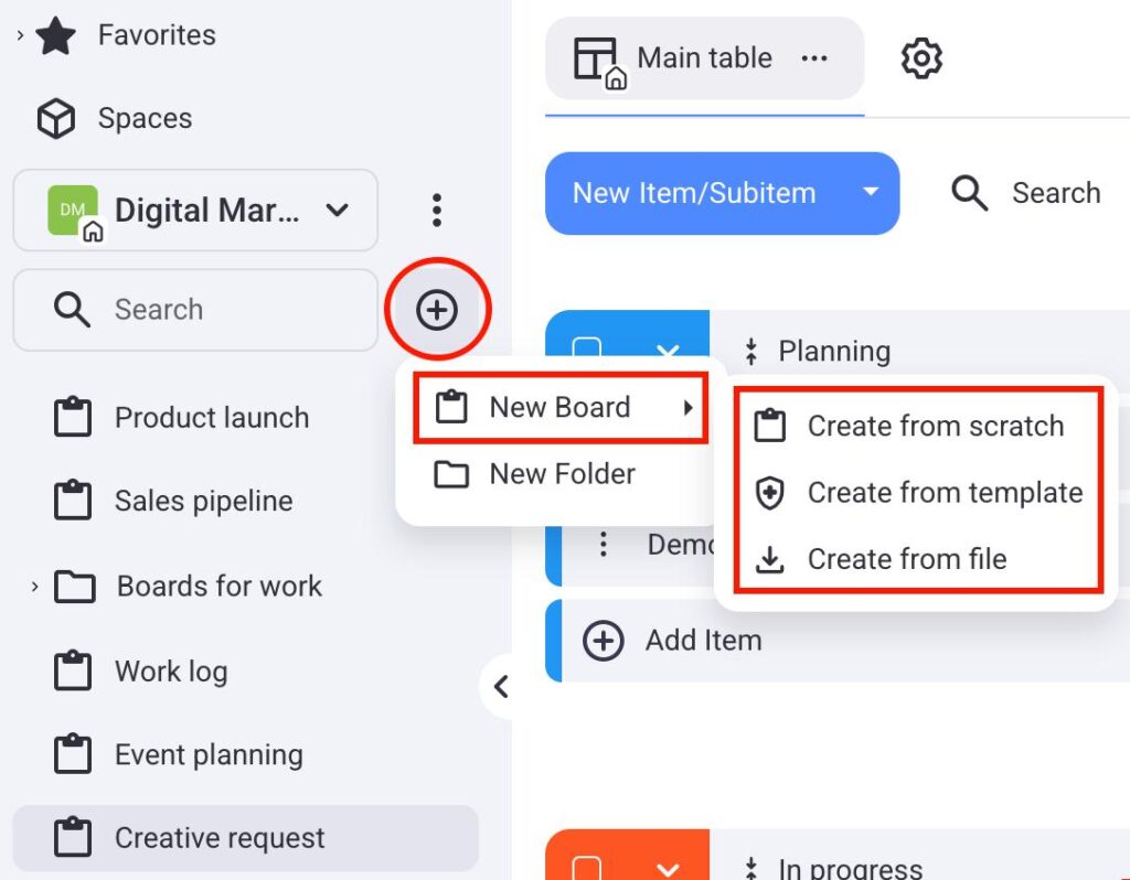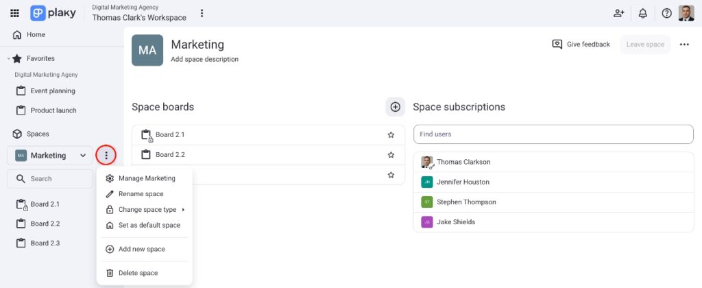 Space is a central place where you can create projects and tasks. Every Space has at least one Board, which includes Items in it. You can manage a Space by accessing the menu and clicking on the three dots next to the Space.