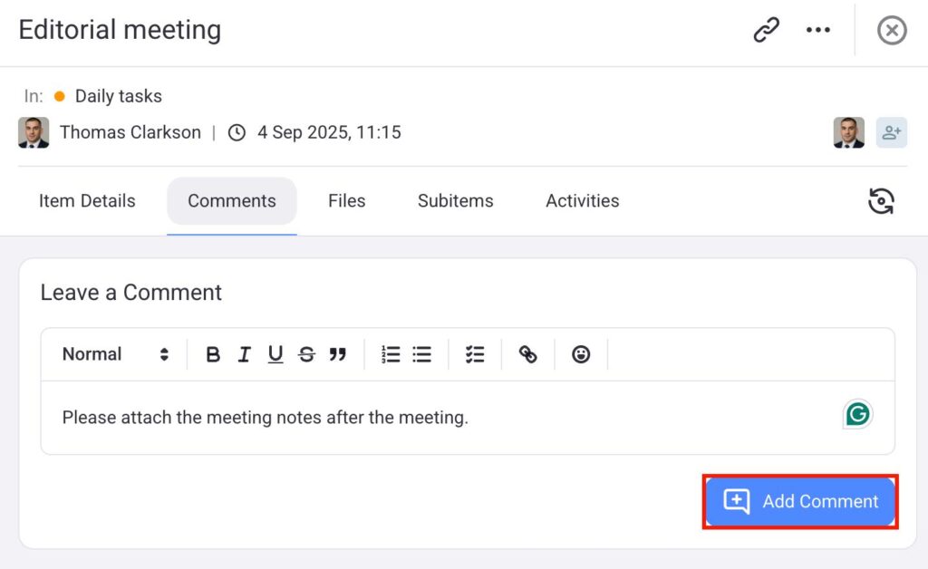 The Comments section lets users leave comments about the task. For example, users can leave remarks on what should be changed before the status of the task can be modified. Here’s how to do so: