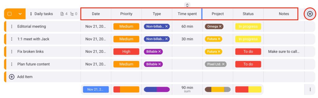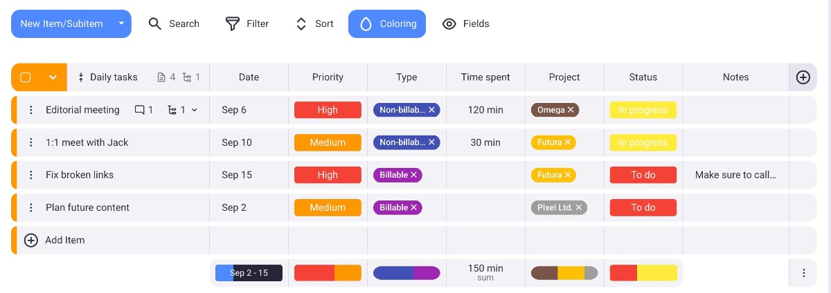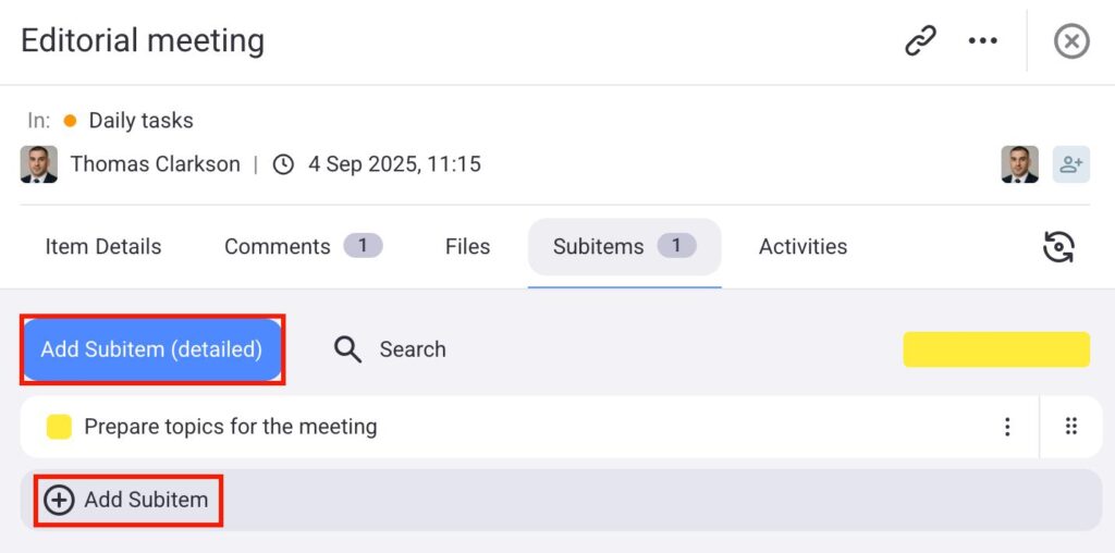 If you are working on a larger task, it might require you to break it down into smaller subtasks. Here’s how to do it directly from the Subitems tab: