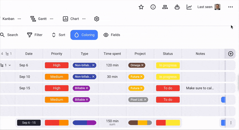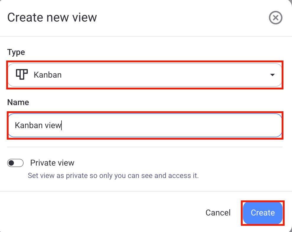 The Kanban view allows you to organize items using a Kanban board. This board displays items in separate cards, with each card representing a stage of the task or project. For example, you can have separate cards for “To do”, “In progress”, and “Done”. Items will then be assigned to the card that matches their status.