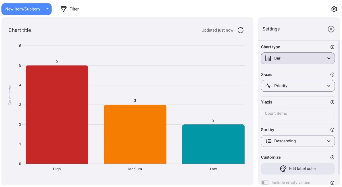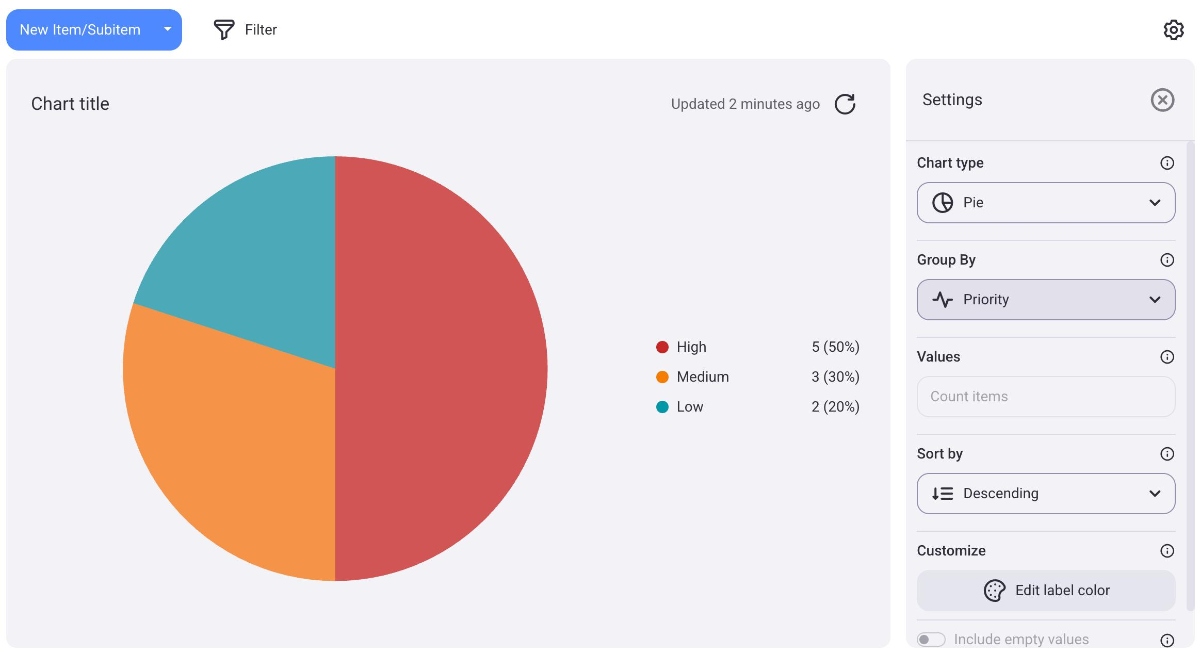 The Chart view provides a visual representation of Items using a pie or bar chart. This allows you to compare the total number of items in a specific Item group. For example, you can group items by their priority status and see how many items require urgent attention.
