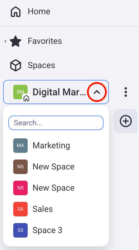 You can view Spaces in the left sidebar, and you can choose between them by clicking the dropdown arrow.