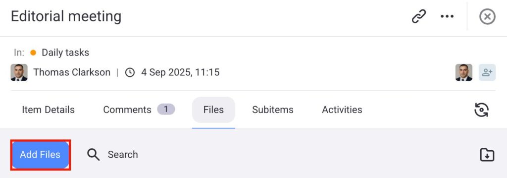 Plaky also allows you to attach files to your tasks, which can be done in the Files tab. For example, you can add images or PDF files related to the task. Here’s how to do this: