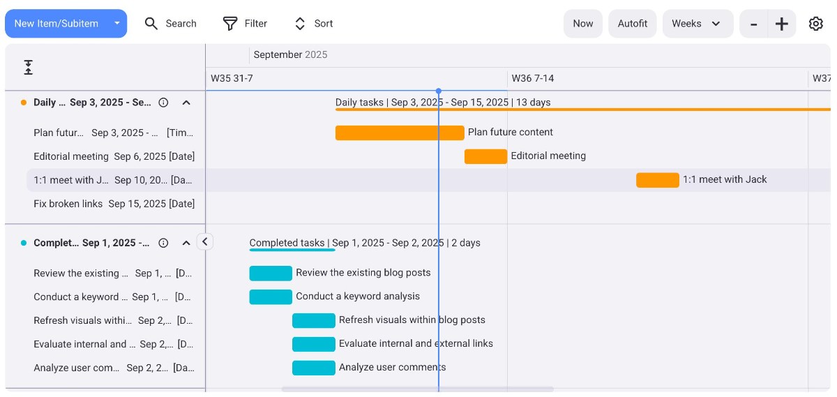 The Gantt view organizes your tasks according to their timeline or date. Every Item will have a block that shows its date or timeline, and the blue line will show the current date. This helps you see how close certain tasks are and when they should be finished.