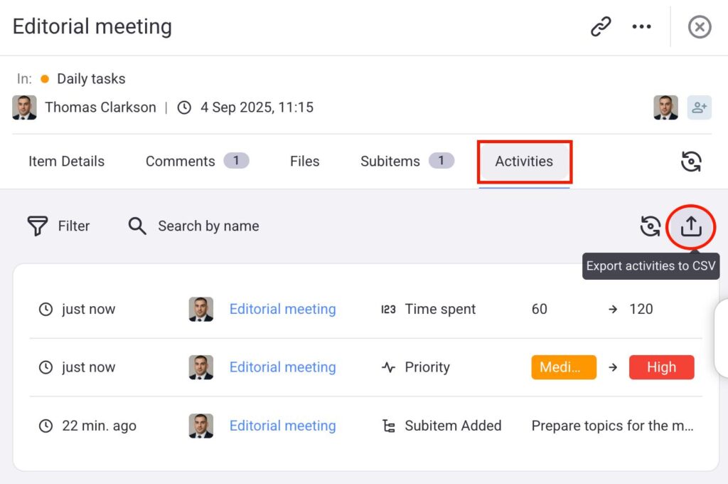 As you and your coworkers modify the Item, all changes will be saved and transparent. To view these changes, open the Activities tab. Here, you can view all changes related to the task, and you can also export them as a CSV file.