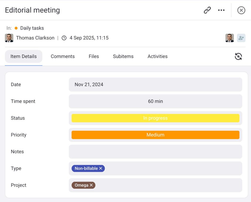 When you click on an Item, it will open its Item card. Here, you can view all the details about the Item, including comments and files, as well as user activity. Also, you can see if the Item has any Subitems under it.