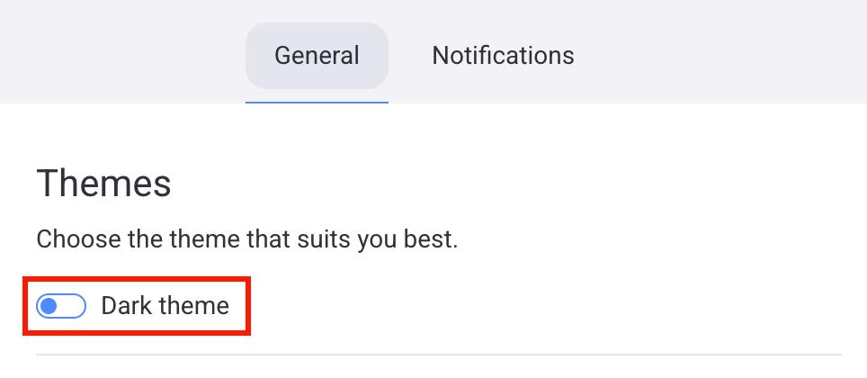 When you open Preferences, the General tab will open by default. Here, you can switch to a dark theme and select your time zone.