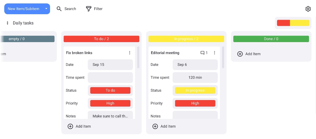 Items/Subitems represent tasks that you and your team are working on. Every Item/Subitem has various fields where you can add information about your assignments. For example, suppose you are working on redesigning the header of your website. In that case, you can create a task that includes all the necessary information for that task (e.g., deadline, assigned person, current status).