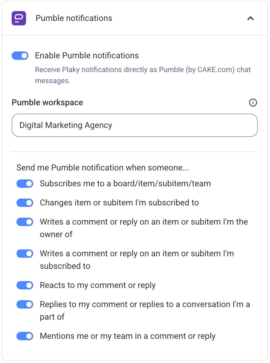 Pumble is a team collaboration and messaging app created by CAKE.com. It integrates with Plaky fairly easily, and you can use it to receive Plaky notifications. Here’s how it works: