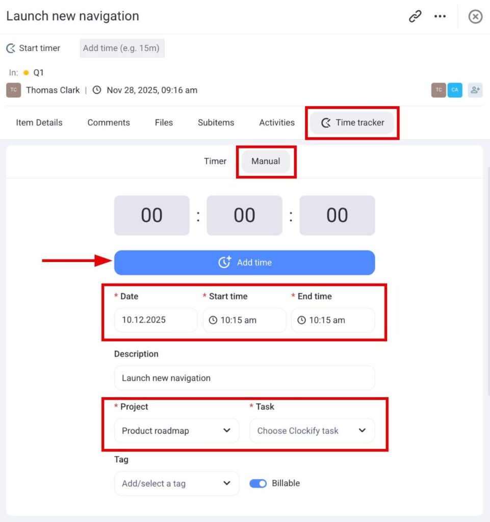 Track time directly from an item/subitem #