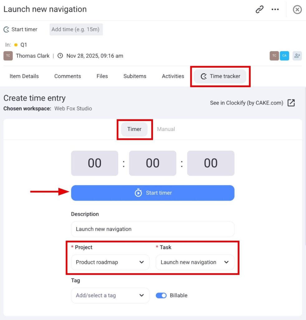 In Plaky, you can track time directly from an item/subitem. Each item/subitem you track in Plaky automatically creates an individual time entry in Clockify. This way, you can track and manage your time in both apps. Here’s how you can do it in Plaky: