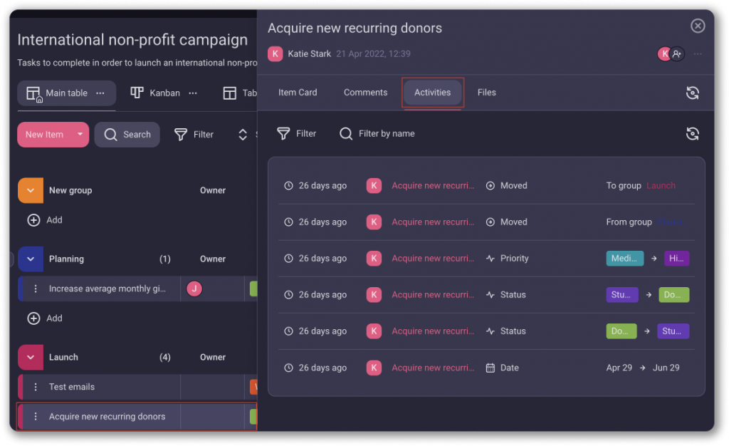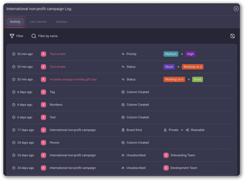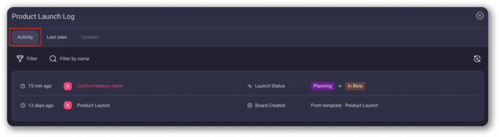 With Activity Log, you can track your Team’s tasks and keep up with the activities on Board or Item.